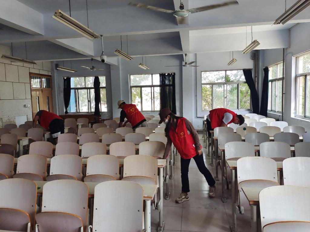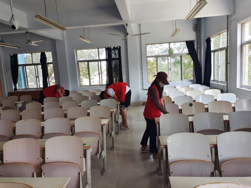 yl8cc永利官网组织志愿者开展教室和宿舍卫生的清洁工作,查看了教室讲台、桌面、抽屉和卫生工具的摆放情况,检查发现,教室卫生、安全状况整体良好,地面干净,教室窗台和黑板没有粉尘,卫生工具摆放整齐,检查人员对个别教室安全、卫生出现的问题状况进行了现场处理或整改。